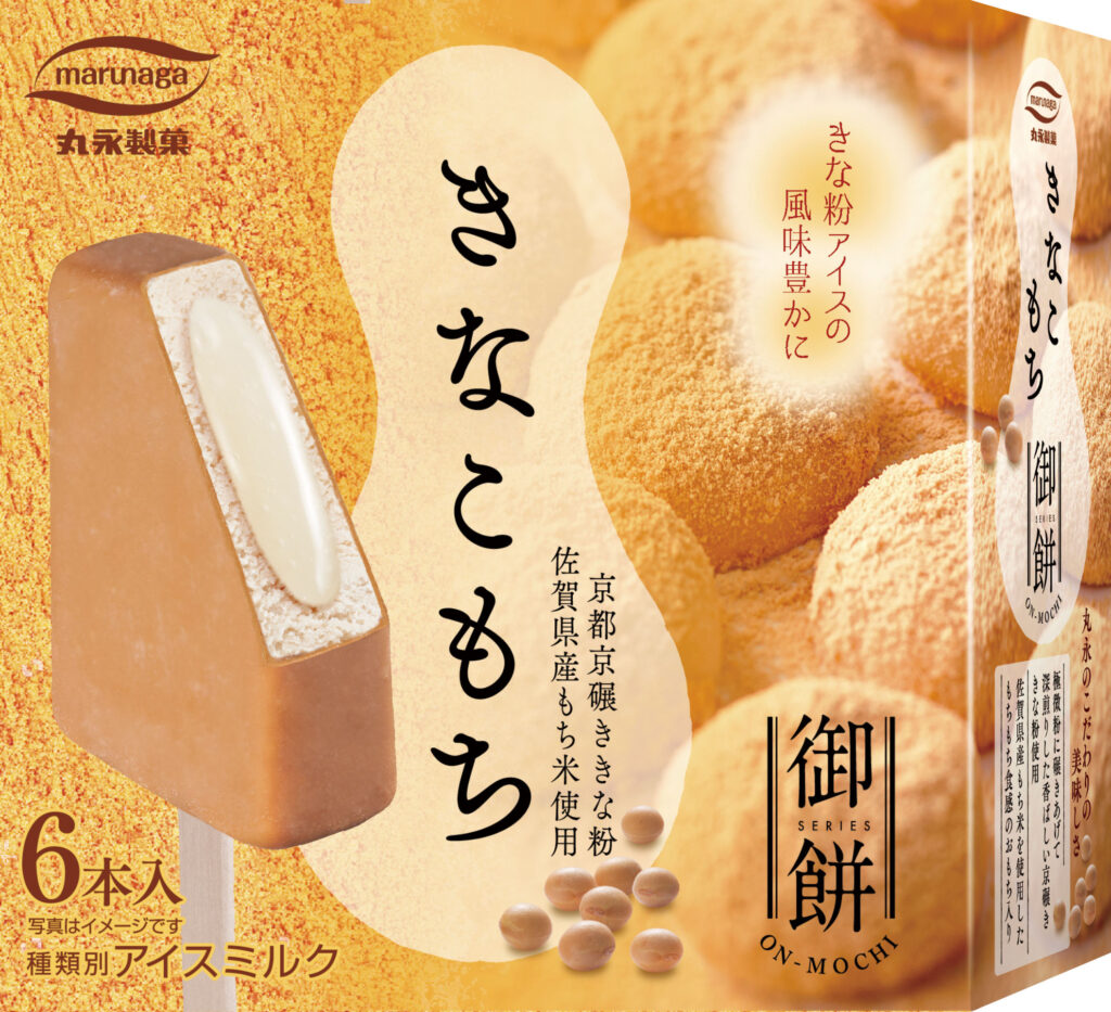 丸永製菓は「”御餅(おんもち)”きなこもち」を発売しました。佐賀県産のモチモチのお餅がたっぷり入っており、その周りには極微粉に碾きあげて深煎りした香ばしい京碾ききな粉を使用したきな粉アイスとなっております。マルチパックだけでなく、単品でも購入可能です。1本(90ml)226kcalです。