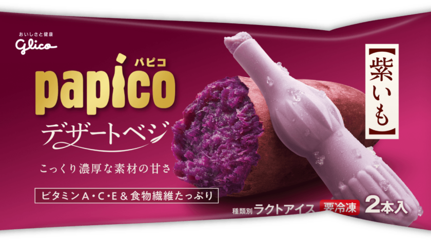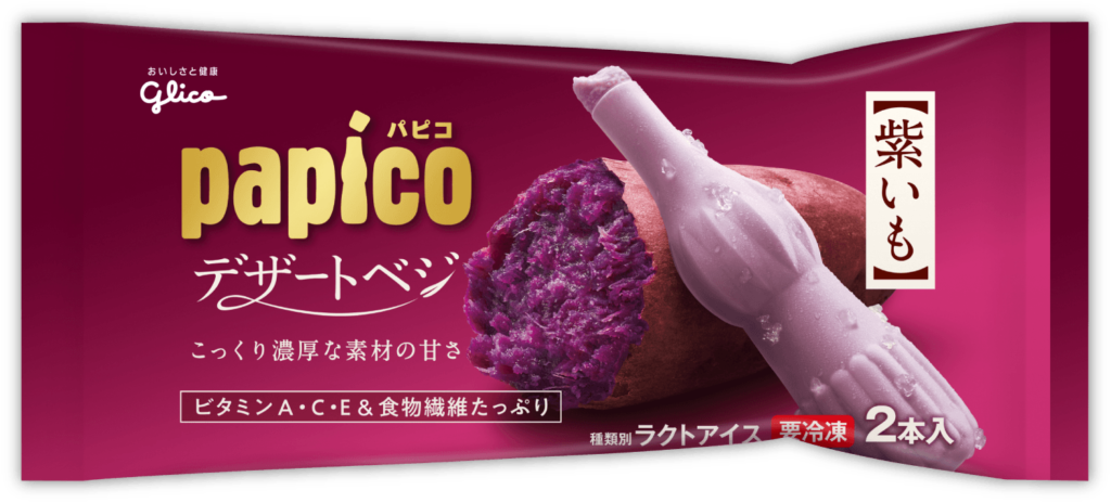 2022年4月4日に発売された「papico デザートベジ 紫いも」。鮮やかな色合いが特長の国産アヤムラサキを使用しており、ビタミンA、ビタミンC、ビタミンEと食物繊維がたっぷり摂れるパピコの新シリーズ。1本(80ml)109kcalです。